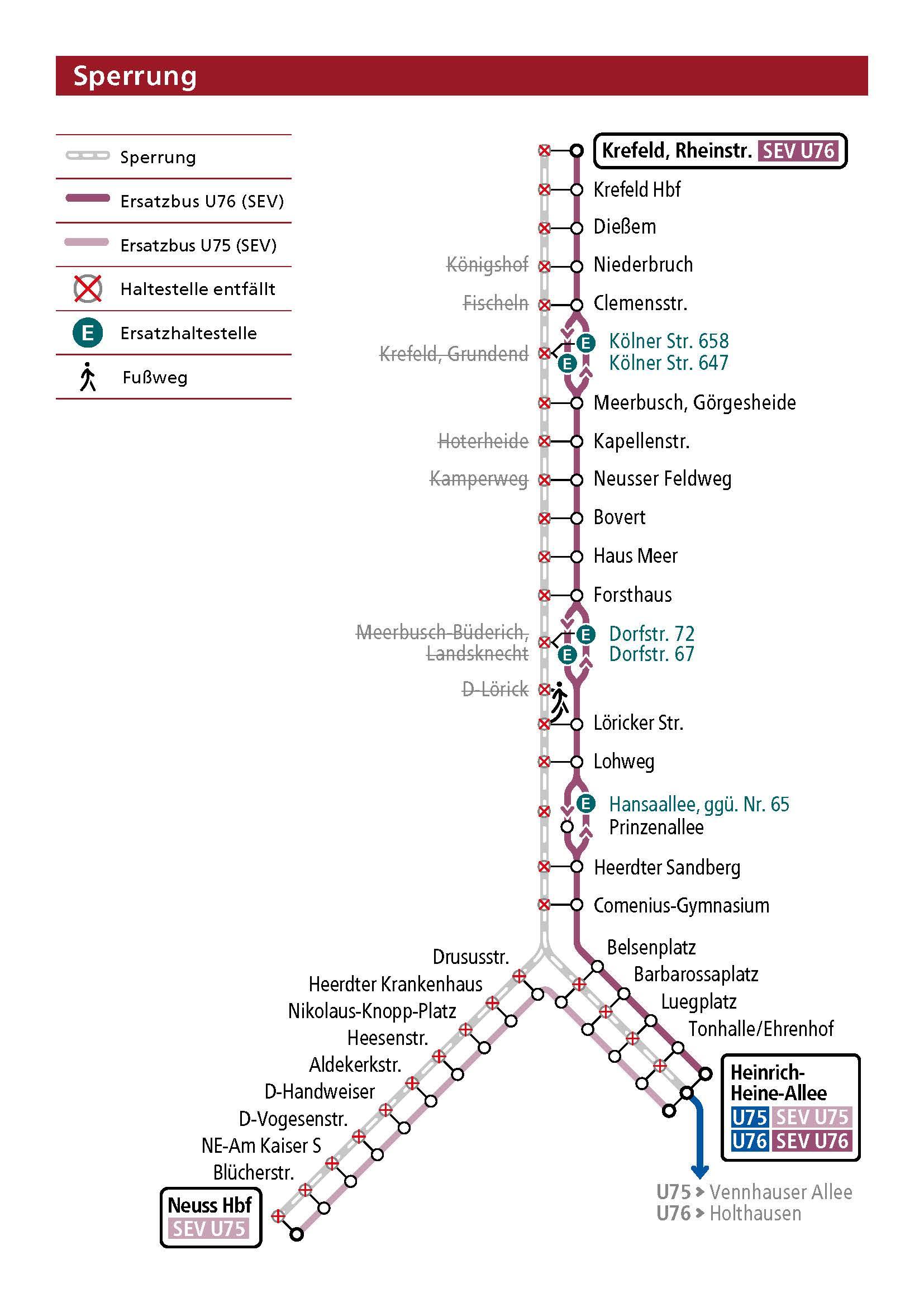 - Zwischen den Haltestellen „Heinrich-Heine-Allee“ und „Krefeld, Rheinstraße“ fahren Ersatzbusse.