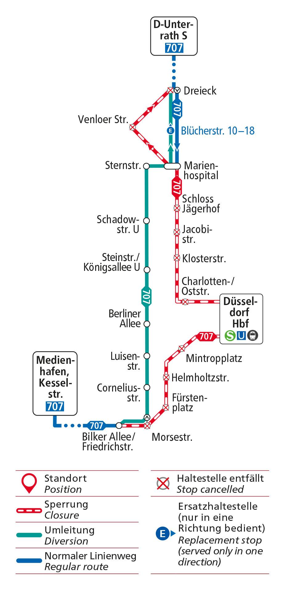 - In Richtung Krefeld halten die Bahnen an den Haltestellen „Düsseldorf Hauptbahnhof“, „Oststraße“, „Steinstraße/Königsallee“ und „Heinrich-Heine-Allee“ jeweils am gegenüberliegenden Steig 1 statt am Steig 3 und in Richtung Holthausen jeweils am gegenüberliegenden Steig 2 statt am Steig 4.